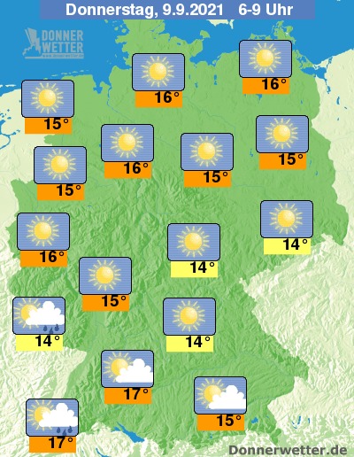 Am Donnerstagmorgen scheint über weiten Teilen der Republik die Sonne oder es ist heiter; vom Saarland bis zum Schwarzwald können sich in den Frühstunden Wolken bilden, aus denen lokale Schauer fallen können. Auch einzelne Gewitter können nicht ausgeschlossen werden.