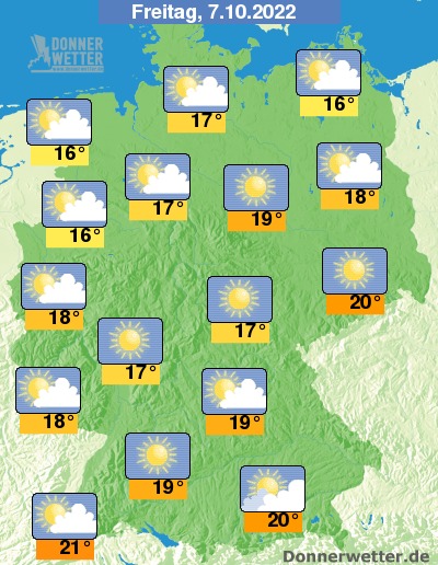 Am Freitag ist es verbreitet heiter oder sonnig, hier und da ist es vor allem am Morgen aber auch trüb, dazu bleibt es trocken. Die Temperatur erreicht 16 Grad in Rostock und bis 21 Grad in Freiburg. An den Küsten weht wieder ein oft stürmischer Wind.