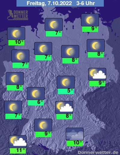 In der bevorstehenden Nacht zeigt sich der Himmel über Deutschland weitgehend sternenklar, hier und da sind ein paar Wolken möglich. Es bleibt trocken bei Werten von 10 Grad in Cuxhaven und 5 Grad in Jena. An der See weht ein starker, teils auch stürmischer Wind.