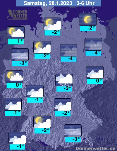 In der kommenden Nacht zeigt sich über der Nordhälfte Deutschlands ein oft sternenklarer oder nur gering bewölkter Himmel, teils ziehen auch mehr Wolken durch, jedoch bleibt es hier trocken. Im übrigen Bundesgebiet ist es häufig stark, teilweise auch aufgelockert bewölkt, dazu fällt vereinzelt etwas Schnee. Stellenweise bildet sich Nebel. Die Temperatur sinkt auf 1 Grad in Bremerhaven und bis -4 Grad in Berlin.