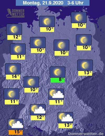 In der folgenden Nacht klingen letzte Schauer am Alpenrand ab und im weiteren Verlauf lockert es auch hier immer mehr auf. Im übrigen Süden ist es meist locker bis wechselnd bewölkt. Im übrigen Bundesgebiet ist es verbreitet sogar sternenklar, dazu bleibt es trocken. Die Temperatur sinkt auf milde 15 Grad am Oberrhein und bis auf etwa 8 Grad im Grabfeld.