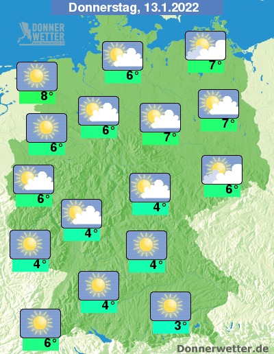 Am Donnerstag ist es teils heiter bis sonnig, gebietsweise ist es aber auch stark bewölkt oder neblig-trüb, dabei bleibt es landesweit trocken. Die Temperatur steigt auf 3 Grad in München und bis 8 Grad in Wilhelmshaven.