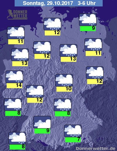 In der kommenden Nacht bleibt der Himmel wolkenverhangen und es fällt verbreitet kräftiger und oft langanhaltender Regen. Dazu verstärkt sich der Wind immer mehr, weht meist frisch bis stark, über der Nordhälfte stürmisch, auf den Bergen und an den Küsten auch orkanartig, dabei sind Orkanböen möglich. In Schauern und Gewittern sind auch im Flachland einzelne orkanartige Böen möglich. Die Temperatur sinkt auf 14 bis 7 Grad.