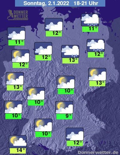 Heute Abend ziehen weiterhin dichte Wolken über den Norden hinweg und bringen vor allem nach Nordosten hin gebietsweise Regen. Im übrigen Land ist es meist stark, hier und da aber auch aufgelockert bewölkt, dazu bleibt es trocken. Die Temperatur liegt bei 9 Grad in Mittelfranken und bis zu 14 Grad im Breisgau. Vor allem nach Norden hin weht ein oft stürmischer Wind, an den Küsten herrscht vielerorts Sturm.
