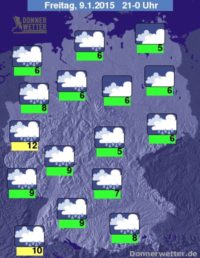 Heute Abend bleiben die Wolken verbreitet dicht und es fällt teils kräftiger, ergiebiger und langanhaltender Regen, weitgehend trocken bleibt es dagegen nur im Nordosten des Landes. Die Abendtemperatur liegt bei 12 Grad in Bonn und etwa 5 Grad an der Müritz. In der Südwesthälfte des Landes weht ein oft stürmischer Wind, dazu sind Sturmböen, teils sogar schwere Sturmböen möglich. Auch im Norden und Osten weht der Wind oft stark, dazu sind stürmische Böen möglich.
