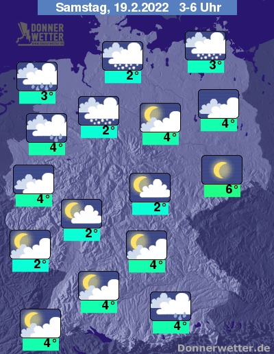 In der Nacht zum Samstag lockert und klart der Himmel verbreitet auf. Im Norden ziehen jedoch meist dichte Wolken übers Land hinweg und es fällt zeitweise Regen, Schneeregen oder Schnee. Im übrigen Bundesgebiet bleibt es weitgehend trocken. Über der Nordhälfte ist es verbreitet stürmisch mit schweren, teils orkanartigen Böen. Vor allem an der Nordsee sind verbreitet Orkanböen möglich. Die Temperatur sinkt auf 6 Grad in Dresden und bis 2 Grad in Hamburg.