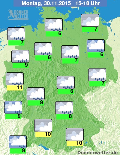 Heute Nachmittag halten sich über Deutschland verbreitet dichte Wolken. Es fällt immer wieder, zum Teil auch langanhaltender und ergiebiger Regen. Die Höchstwerte liegen bei 6 Grad in der Lüneburger Heide und um 11 Grad im Rheinland. Der Wind weht oft stürmisch mit teils schweren Sturmböen, auf den Bergen und an den Küsten sind orkanartige Böen möglich.