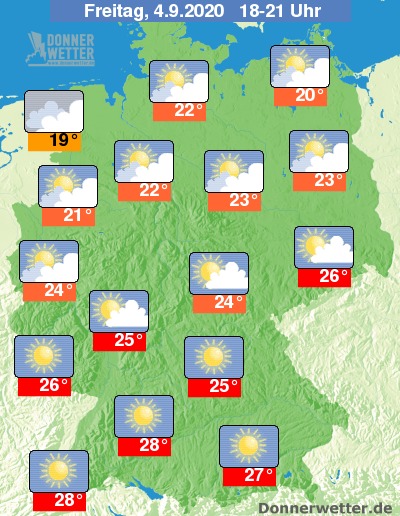 Die Temperaturen liegen am frühen Abend noch zwischen verhaltenen 19 Grad an der Ems und sommerlichen 28 Grad im Südwesten.