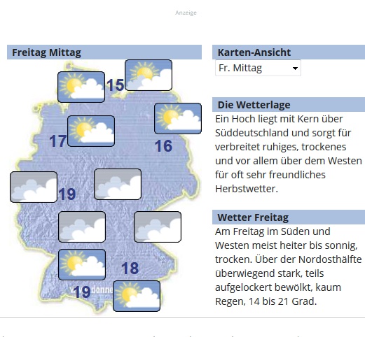 In NRW und Niedersachsen ist es noch grau und es regnet etwas. Sonst wird es langsam freundlicher und wärmer. Fast überall erreichen die Werte fast 20 Grad C. Zum Wochenende kommt Tanja dann richtig in Fahrt.