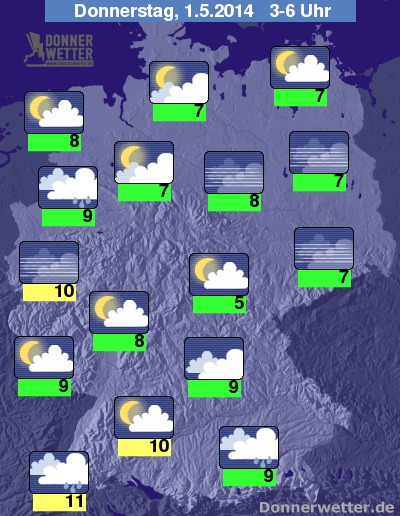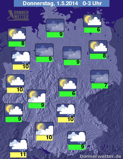 Wer am frühen Donnerstagmorgen noch nicht müde ist, den werden auch die paar Schauer nicht vom weiterfeiern abhalten. Auch in der zweiten Nachthälfte sind diese vermehrt im Süden Deutschlands und im Münsterland anzutreffen. Bei teils lockerer Bewölkung, teils klarem Himmel bleibt es sonst häufig niederschlagsfrei. Und auch die Temperaturen bleiben in der zweiten Nachthälfte moderat: Im Südwesten teils zweistellige Tiefsttemperaturen um 11 Grad, im Thüringer Wald um 5 Grad.