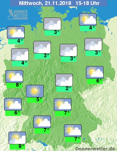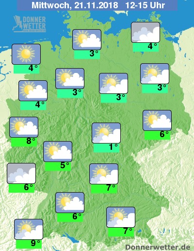 Am frühen Nachmittag halten sich gebietsweise dichtere Wolken, teilweise ist es auch neblig-trübe, regional gibt es aber auch einige größere Aufheiterungen mit längeren sonnigen Abschnitten. Abgesehen von einigen Tröpfen, auf den Höhen der Mittelgebirgen auch Flöckchen aus dichterem Wolkengrau bleibt es aber allgemein niederschlagsfrei.