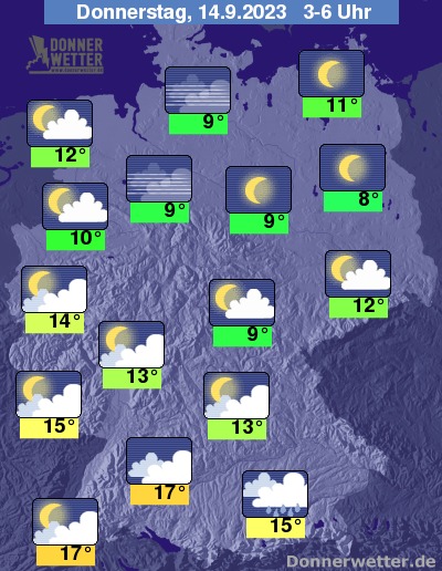 In der Nacht zum Donnerstag klart der Himmel über der Nordhälfte Deutschlands verbreitet auf, dazu bleibt es trocken. Weiter nach Süden hin werden die Wolken dichter und im Alpenvorland fällt auch noch gebietsweise Regen, sonst bleibt es aber weitgehend trocken. Die Temperatur sinkt auf 17 Grad in Stuttgart und 8 Grad in Berlin.