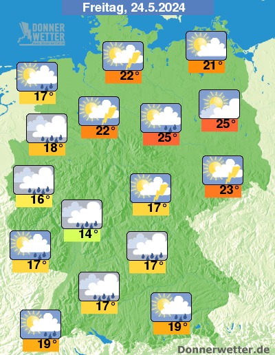 Am Freitag zeigt sich der Himmel über dem Osten und Nordosten des Landes heiter bis wolkig oder es ist aufgelockert bewölkt, dabei bleibt es meist trocken. In den übrigen Landesteilen überwiegt wechselnde oder starke Bewölkung; vor allem in den mittleren Landesteilen muss immer wieder mit Schauern und Gewitter, regional auch mit unwetterartigem Starkregen einhergehend, gerechnet werden. Auch im Süden des Landes sind sind zeitweise Schauer möglich.
