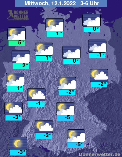 In der folgenden Nacht ist der Himmel anfangs vor allem über der Südosthälfte noch oft sternenklar, jedoch ziehen im Nachtverlauf auch hier, wie schon im übrigen Land, mehr und teils dichte Wolken auf. Dazwischen zeigen sich aber auch mögliche Auflockerungen. Es bleibt landesweit trocken bei Tiefstwerten von 5 Grad in Wilhelmshaven und bis -5 Grad in München.