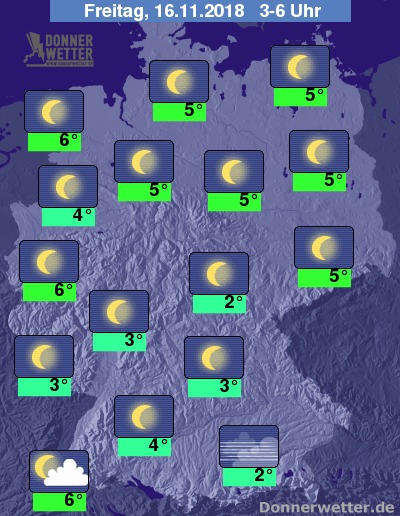 Bis zu den Frühstunden kühlt die Luft in bewohnbaren Gebieten auf 2 bis 6 Grad ab. Außerhalb von Ortschaften wird es aber noch kälter und es kann stellenweise zu leichtem Frost kommen.