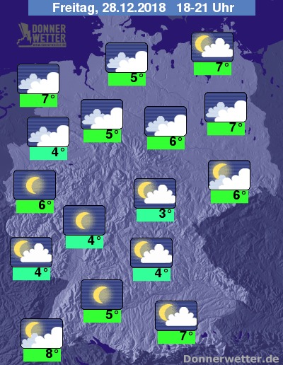 Am Abend bleibt es im Norden abgesehen vom Ostseeumfeld eher wolkenverhangen, sonst zeigen sich teilweise Mond und Sterne, teilweise halten sich aber auch zähe Nebel- oder Hochnebelgebiete. Nennenswerter Niederschlag fällt nicht.