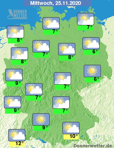 Die Höchsttemperaturen liegen zwischen 6 Grad in Brandenburg und 12 oder 13 Grad im Breisgau. Im Dauergrau bleibt es jedoch dementsprechend kühler.