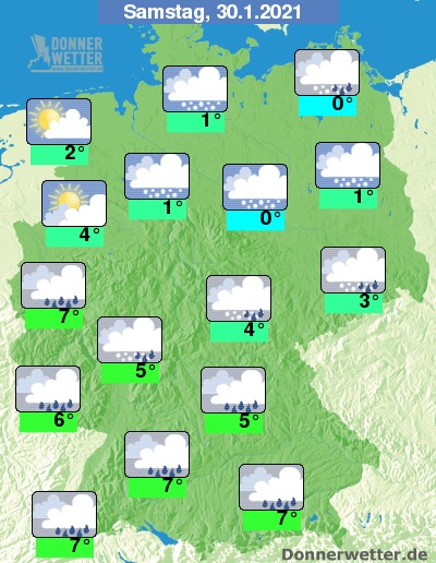 Heute halten sich im Norden und Osten dichte Wolken und es fällt zeitweise Regen, Schneeregen oder Schnee. Über der Südhälfte des Landes bleibt es bedeckt und es fällt gebietsweise Regen, zum Teil auch Schnee oder Schneeregen. Im übrigen Land ist es teils stark, teils aufgelockert bewölkt und dazu meist trocken. Die Temperatur steigt auf 0 Grad in Magdeburg und bis 7 Grad entlang des Rheins.