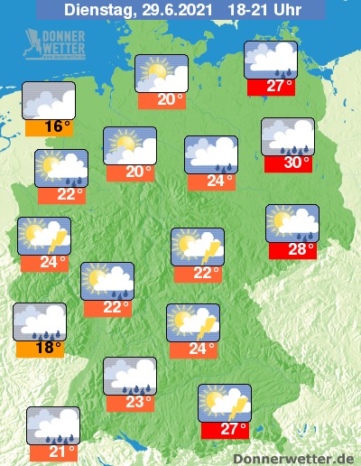 Heute Abend ist es über dem Norden und Osten meist dicht bewölkt, im übrigen Land ist es teils locker, teils dicht bewölkt. Es bilden sich landesweit Schauer und vielerorts auch Gewitter. Die Temperatur liegt bei kühlen 16 Grad an der Nordsee und bis 30 Grad in Berlin.