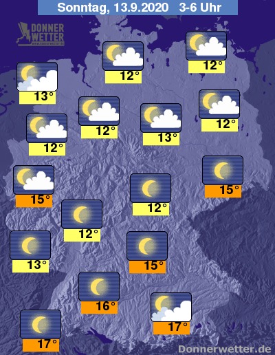In der folgenden Nacht zeigt sich der Himmel über der Südosthälfte Deutschlands weitgehend sternenklar. Weiter nach Norden und Westen hin ziehen allerdings oft auch einige, jedoch meist lockere Wolkenfelder durch. Es bleibt landesweit trocken bei Tiefstwerten von 17 Grad in München und bis 12 Grad in Hamburg.