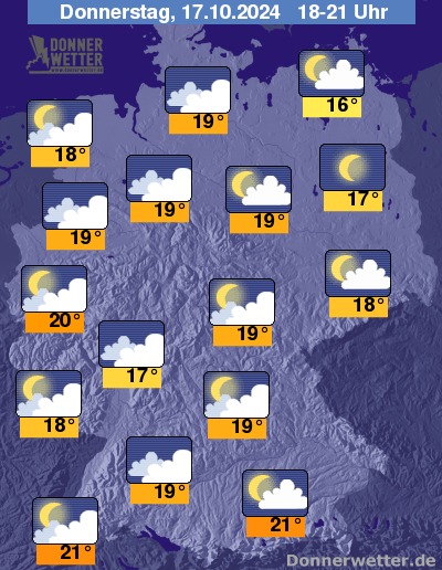 Heute Abend ziehen viele und oft auch dichte Wolken über die Westhälfte Deutschlands, auch im Norden ist es überwiegend stark bewölkt. In den östlichen Landesteilen sowie im Nordosten und Südosten ist es hingegen eher gering bis wechselnd bewölkt. Etwas Regen ist lediglich von der Eifel bis ins Rheinland möglich, sonst bleibt es trocken bei Werten von 16 Grad in Stralsund und rund 21 Grad in Freiburg.