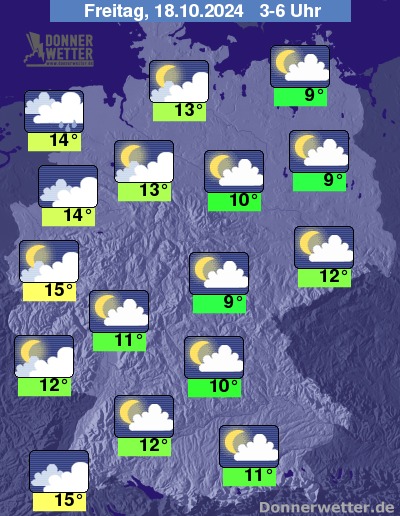 In der Nacht zum Freitag können dichte Wolken vom Niederrhein bis ins Emsland gebietsweise Regen bringen. Im Westen und Südwesten ist es oft stark bewölkt, aber trocken. Im großen Rest des Landes ist es meist aufgelockert oder sogar nur locker bewölkt, dazu bleibt es trocken. Die Temperatur sinkt auf 15 Grad in Köln und bis 9 Grad in Erfurt.