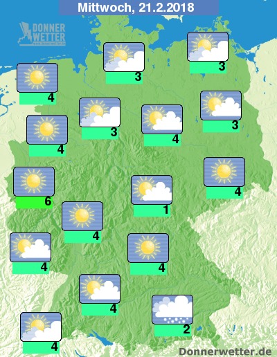 Längere sonnige Abschnitte wechseln sich in großen Bereichen unseres Landes mit lockeren Wolkenfeldern ab. Im Nordosten und an den Alpen überwiegen aber die Wolken. Vereinzelt fallen einige Flocken. Die Höchsttemperaturen liegen zwischen 0 und 4 Grad im Osten und 3 bis 6 Grad im Westen. Der Wind weht insgesamt nur leicht bis mäßig und kommt aus Nordost. Gebietsweise kann er auch bereits schon etwas auffrischen.