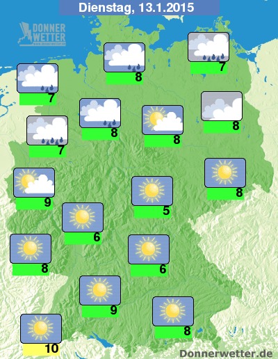 Heute halten sich vor allem im Norden, aber teils auch im Westen dichte Wolken, die hier für zum Teil kräftigen Regen sorgen. Sehr viel freundlicher mit häufigem Sonnenschein und nicht selten sogar sonnigem Wetter zeigt sich die Südhälfte der Republik, hier bleibt es trocken. Die Temperatur steigt auf 5 Grad im Coburger Land und bis auf 10 Grad im Breisgau. An den Küsten weht ein zum Teil starker Wind mit stürmischen Böen.