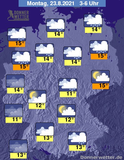 In der Nacht zum Montag fällt insbesondere im Norden, aber auch am Alpenrand zum Teil langanhaltender Regen. Im übrigen Bundesgebiet ist es teils gering, teils aber auch stärker bewölkt, dazu bilden sich aber nur selten Schauer. Die Temperatur sinkt auf 15 Grad in Berlin und bis 11 Grad in Saarbrücken.