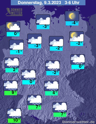 In der Nacht zum Donnerstag ist der Himmel lediglich im Norden oft nur leicht bis aufgelockert, sonst jedoch weitgehend dicht bewölkt. Über der Nordhälfte bleibt es dabei weitgehend trocken, südlich angrenzend fällt oft Schnee oder Schneeregen. Etwa südlich des Mains fallen die Niederschläge als Regen. Die Temperatur sinkt auf milde 10 Grad in Freiburg und bis -4 Grad in Stralsund.