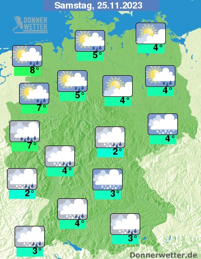 Am Samstag zeigt sich der Himmel über der Nord- und Osthälfte meist heiter oder es ist nur gering bewölkt, vereinzelt muss dabei mit Schauern gerechnet werden. In den übrigen Landesteilen ist es stark bewölkt oder bedeckt und immer wieder fallen Schauer, im Westen meist als Regen, sonst als Schneeregen oder Schnee.