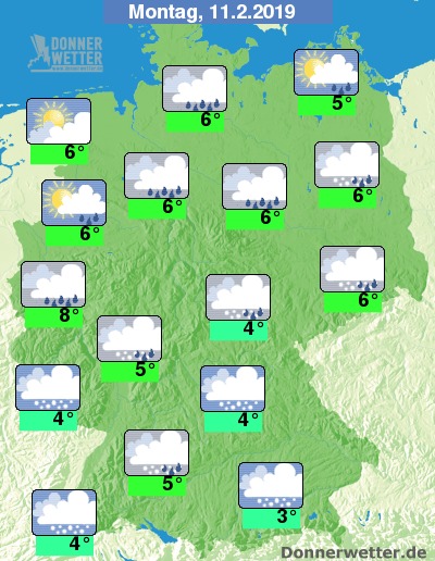 Die neue Woche startet mit zeitweiligen Lichtblicken an den Küsten, in den übrigen Landesteilen zeigt sich der Himmel stark bewölkt oder bedeckt. Verbreitet muss am Montag mit Niederschlägen gerechnet werden, die in der Nordwesthälfte meist als Regen- oder Schneeregen, im Süden auch als Schnee fallen können. Der Wind weht mäßig bis frisch, teils auch stürmisch aus West / Nordwest.