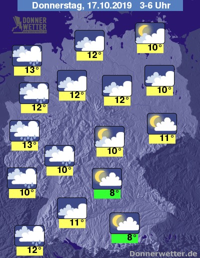 Bis zu den Frühstunden kühlt die Luft auf 7 bis 13 Grad ab. Am mildesten bleibt es dabei in den Ballungsgebieten des Westens und an der unteren Ems, am kältesten wird es in Bayern.