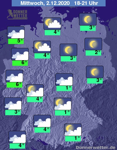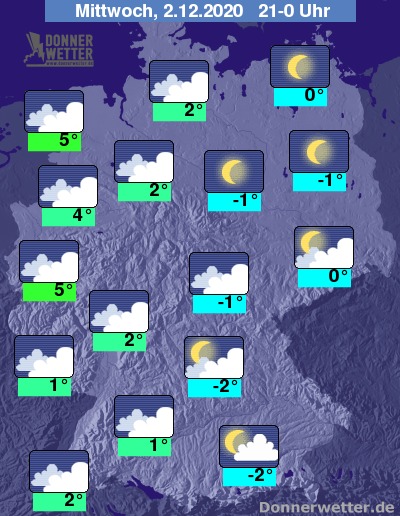 Am Abend zeigen sich im Norden und Nordosten häufig Mond und Sterne, in den anderen Gebieten gibt es nur regional größere Wolkenlücken. Vor allem in höheren Lagen ist es neblig-trübe. Abgesehen von etwas Sprühregen oder Schneegriesel je nach Höhenlage bleibt es aber niederschlagsfrei.