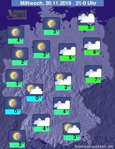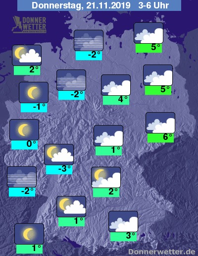 Bis zu den Frühstunden kühlt die Luft auf 0 bis 4 Grad ab. Unter den dichten Wolken im Nordosten bleibt es etwas milder. Bei längerem Aufklaren und Nebel droht leichter Frost zwischen -3 und 0 Grad, sowie Gefahr von überfrierender Nässe oder Reif.
