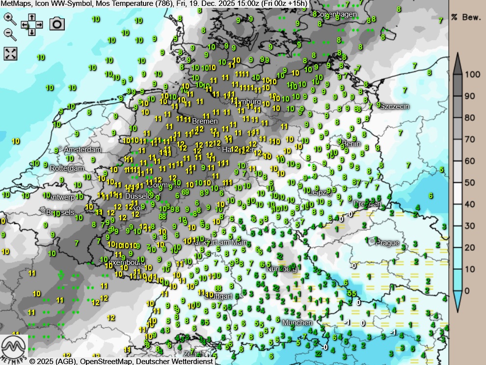 Die Temperaturen erreichen Höchstwerte um 3 Grad im östlichen Bayern und 13 Grad am Niederrhein.