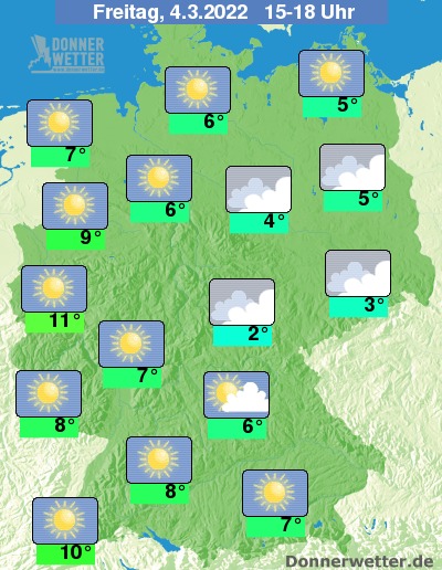 Die Temperaturen erreichen am Nachmittag Höchstwerte um 2 Grad in Erfurt, 6 Grad an der Weser und um 11 Grad im Rheinland.