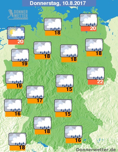 In der bevorstehenden Nacht bleibt es lediglich entlang des Niederrheins und der Ems meist locker bewölkt und dazu trocken, sonst ziehen von Süden her verbreitet dichte Wolken auf und es fällt zeitweise, zum Teil auch kräftiger und gewittriger Regen. Die Temperatur sinkt auf 18 Grad in Dresden und bis 12 Grad am Taunus.