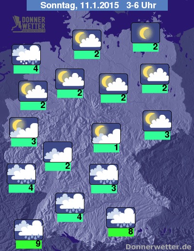 Am Sonntag bleibt es am Himmel weitgehend stark oder dicht bewölkt, größere Auflockerungen sind am ehesten an der Nordsee möglich. Es fällt zeitweise, zum Teil kräftiger Schnee oder Schneeregen, nach Westen und Norden hin auch Regen. Die Temperatur steigt auf nasskalte Werte zwischen 1 Grad in München und 6 Grad in Emden. Der Wind weht frisch bis stark, in Böen auch stürmisch. An den Küsten und auf den Bergen herrscht teils Sturm, dabei können teils schwere Sturmböen auftreten.