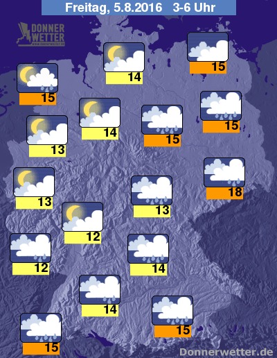 In der kommenden Nacht bleibt es über der Südosthälfte der Republik weitgehend bedeckt und es fällt zeitweise, oft auch langanhaltender und zum Teil ergiebiger Regen. Im Südosten und am Erzgebirge sind stellenweise starke Gewitter möglich. Weiter nach Norden und Westen hin ist die Bewölkung hier und da aufgelockert, oft aber auch stark bewölkt, dabei bleibt es weitgehend trocken. Die Temperatur sinkt auf 18 Grad in Dresden und bis etwa 12 Grad in der Wetterau.