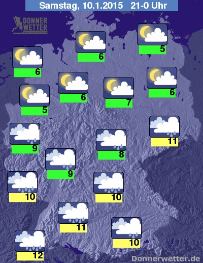 In der Nacht zum Sonntag ist es im Norden, ab etwa Mitternacht auch in der Mitte des Landes meist aufgelockert oder locker bewölkt und dazu weitgehend trocken, weiter nach Süden halten sich die Wolken dagegen dicht und es fällt auch immer wieder zum Teil kräftiger und ergiebiger Regen. Gegen Morgen mischt sich auch gebietsweise Schnee unter den Regen. Die Temperatur sinkt auf 9 Grad am Bodensee und etwa 1 Grad im Grabfeld. Es weht verbreitet starker und in Böen stürmischer Wind, vereinzelte Sturmböen sind möglich. Auf den Bergen und an der See sind neben Sturmböen auch teils schwere Sturmböen möglich.