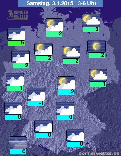 Der Samstag wird ein verbreitet trüber, nasser und teils windiger Tag. Dabei ist es zumindest in der Osthälfte am Vormittag noch weitgehend trocken, jedoch schon meist bedeckt. Sonst ziehen vormittags von Westen her bereits dichte Wolken mit Regen, Schneeregen und Schnee auf, dabei kann es vielerorts glatt auf den Straßen werden. Genauere Informationen zur Wettergefahrenlage erhalten Sie unter www.unwetter.de! Am Nachmittag ziehen die dichten Regen-, Schneeregen und Schneewolken auch in die Osthälfte des Landes und sorgen hier besonders im Osten für vielfach rutschige Straßen durch Nassschnee oder Schneematsch. Im Süden fällt der Niederschlag zumeist als Regen, jedoch kann es regional auch hierbei, durch mögliches Blitzeis zum Teil spiegelglatt werden. Vor allem im Norden und Osten weht dazu noch ein teils starker Wind. Die Temperaturen steigen auf 0 Grad im Coburger Land und bis auf 8 Grad im Breisgau.