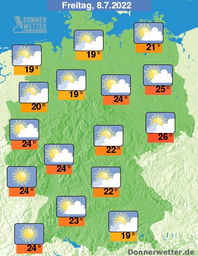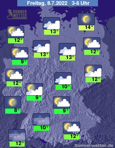 In der Nacht zum Freitag bilden sich am Alpenrand bei dichter Bewölkung noch weitere Schauer. Im übrigen Land ist es vor allem von der Mitte des Landes bis in den Norden oft stark bewölkt, sonst verbreitet locker bewölkt bis sternenklar. Es bleibt dazu trocken bei Tiefstwerten von 14 Grad in Rostock und 8 Grad im Saargau.