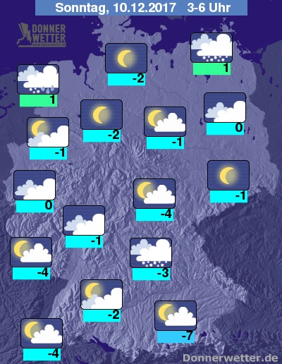 In der folgenden Nacht ist es zum Teil nur gering bis aufgelockert, vorübergehend aber auch stark bewölkt, dabei fällt vor allem an den Küsten gebietsweise Schnee, sonst fällt nur gelegentlich Schnee. Mit stellenweiser Glätte ist zu rechnen! Die Temperatur sinkt auf 1 Grad an Nord- und Ostsee und bis -7 Grad in Rosenheim.
