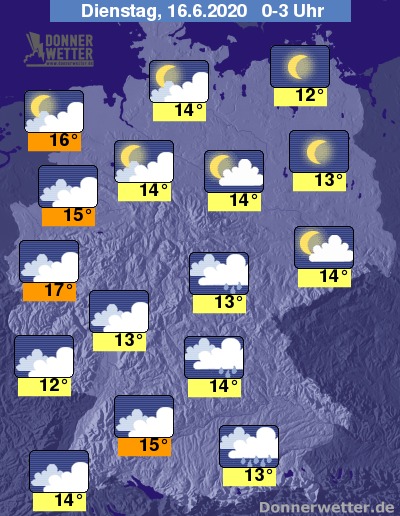 In der Nacht überwiegt im norddeutschen Tiefland eine Mix aus lockerer und aufgelockerter Bewölkung, im Nordosten funkeln die Sterne auch von einem wolkenlosen Himmel. Im Süden und Westen des Landes bleibt der Himmel meist bedeckt, im Südosten fällt dabei auch immer wieder Regen.