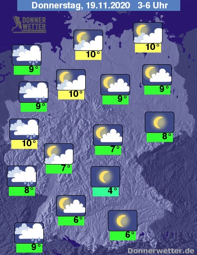 Bis zu den Frühstunden kühlt die Luft meist auf 9 bis 4 Grad ab, örtlich kann es im Süden leichten Bodenfrost geben. Im Westen und im Norden halten sich die Temperaturen noch im zweistelligen Bereich auf.