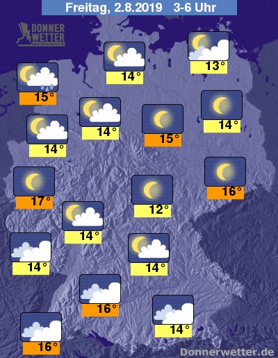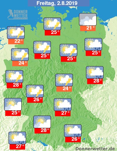 Der Freitag wechseln sich die Sonne und die Wolken ab. Dichter bewölkt ist es an der Ostseeküste. In den Wolkenfeldern können sich fast im ganzen Bundesgebiet Schauer und Gewitter niederlassen. Die Temperaturen steigen auf 22 Grad im Emsland und bis zu 28 Grad im Erzgebirge.