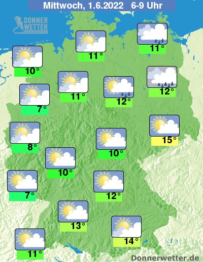 Die Temperaturen erreichen in den späten Morgenstunden Werte um 7 Grad im Saarland, 11 Grad an der Ostseeküste und 15 Grad in Sächsischen Schweiz.