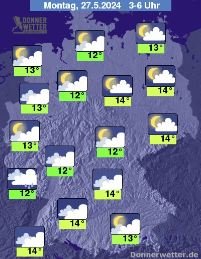 In der Nacht auf Montag ist der Himmel über der Nordhälfte überwiegend locker oder aufgelockert, im Süden auch stark bewölkt. Im Osten und Nordosten lassen die Niederschläge dabei nach, im Nordwesten und Südwesten ziehen aber bereits neue Regengebiete auf. In den übrigen Landesteilen ist es meist niederschlagsfrei.