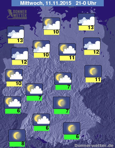 Auch der weitere Abendverlauf bringt nur selten Schauer. Im Norden kann die dichte Wolkendecke stellenweise auflockern. Die Temperaturen sinken auf Werte um 13 Grad C bis 6 Grad C.